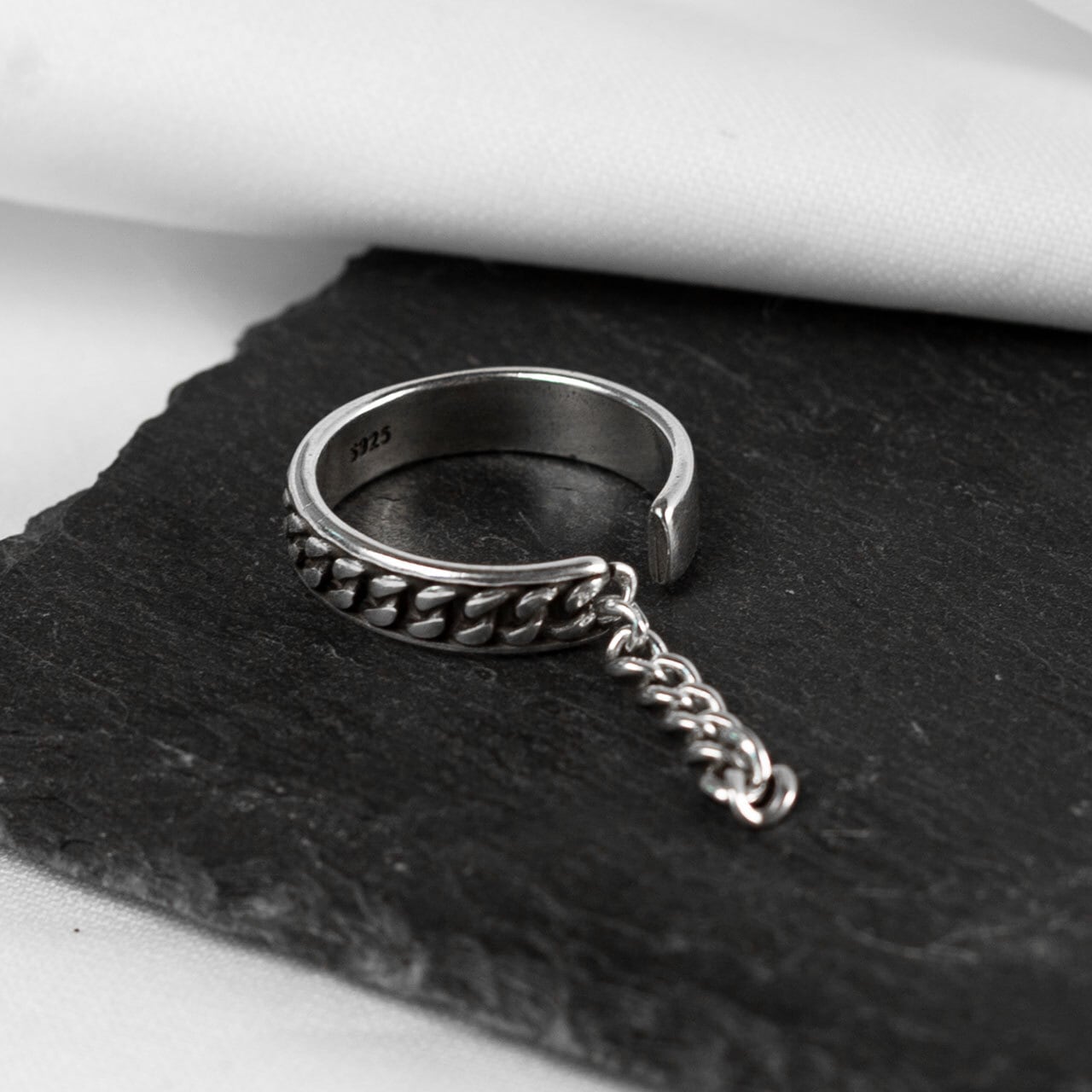 シンプルなデザインのリングからチェーンが零れ落ち、