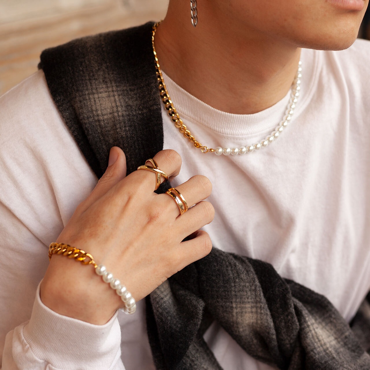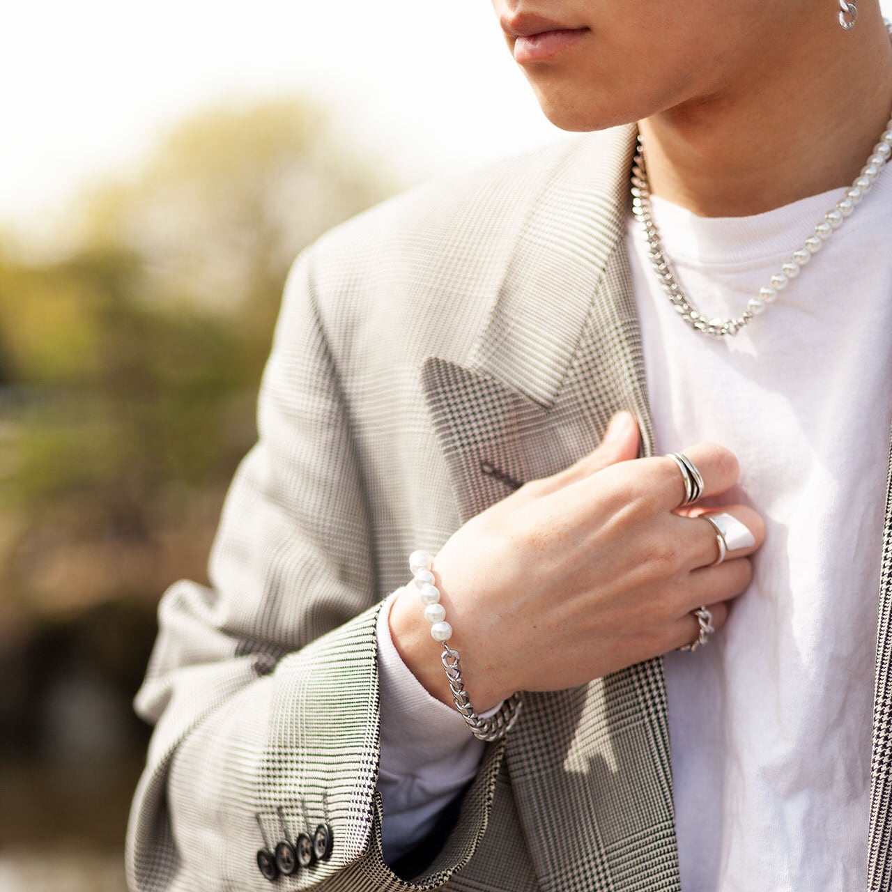 ブレスレットと合わせることで統一感とこなれ感を演出します。