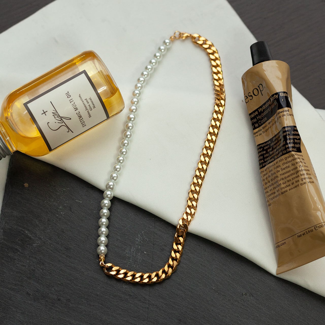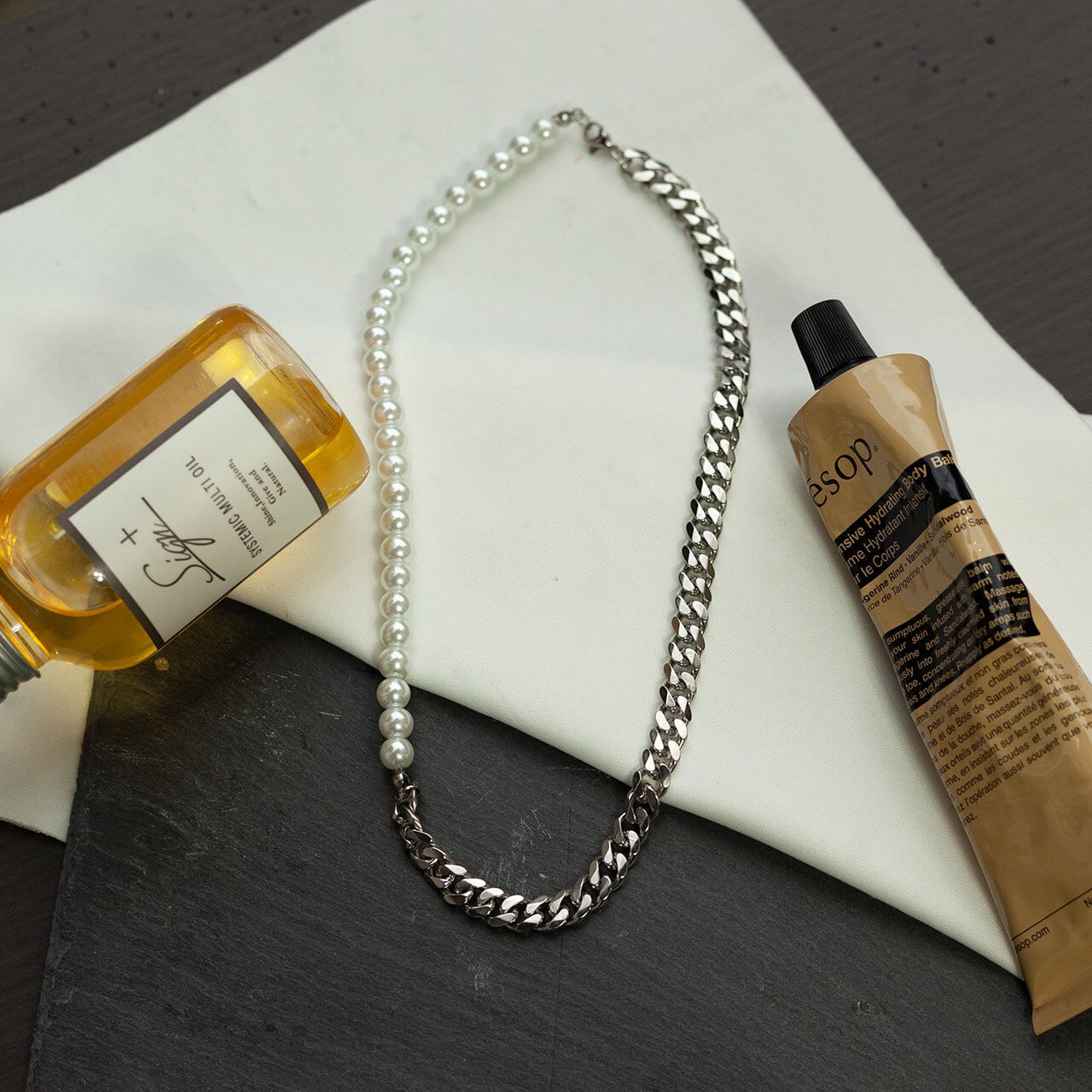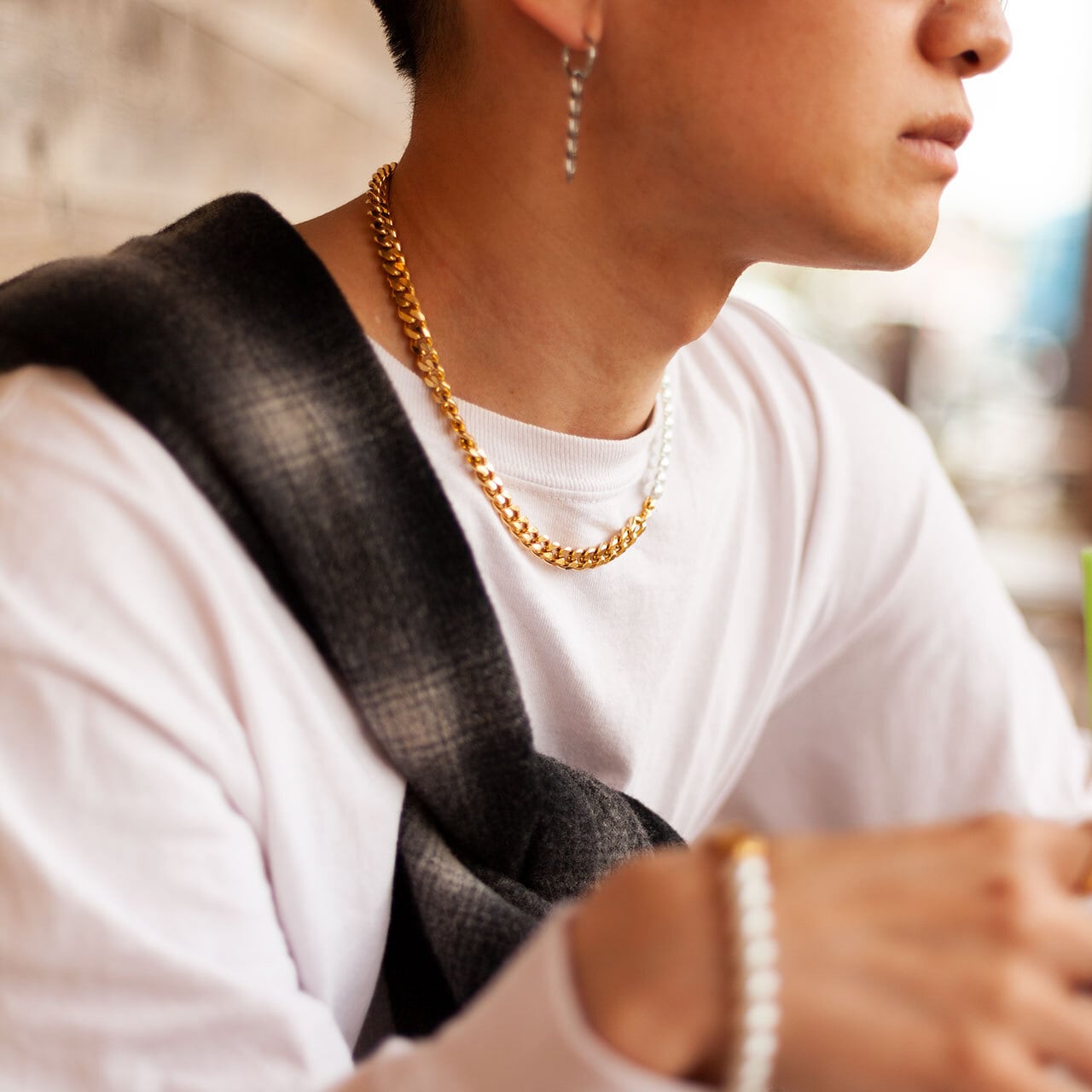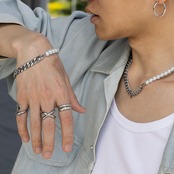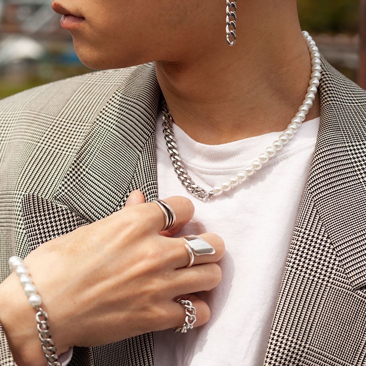 フェミニンなパールと無骨なチェーンのコンビネックレス。