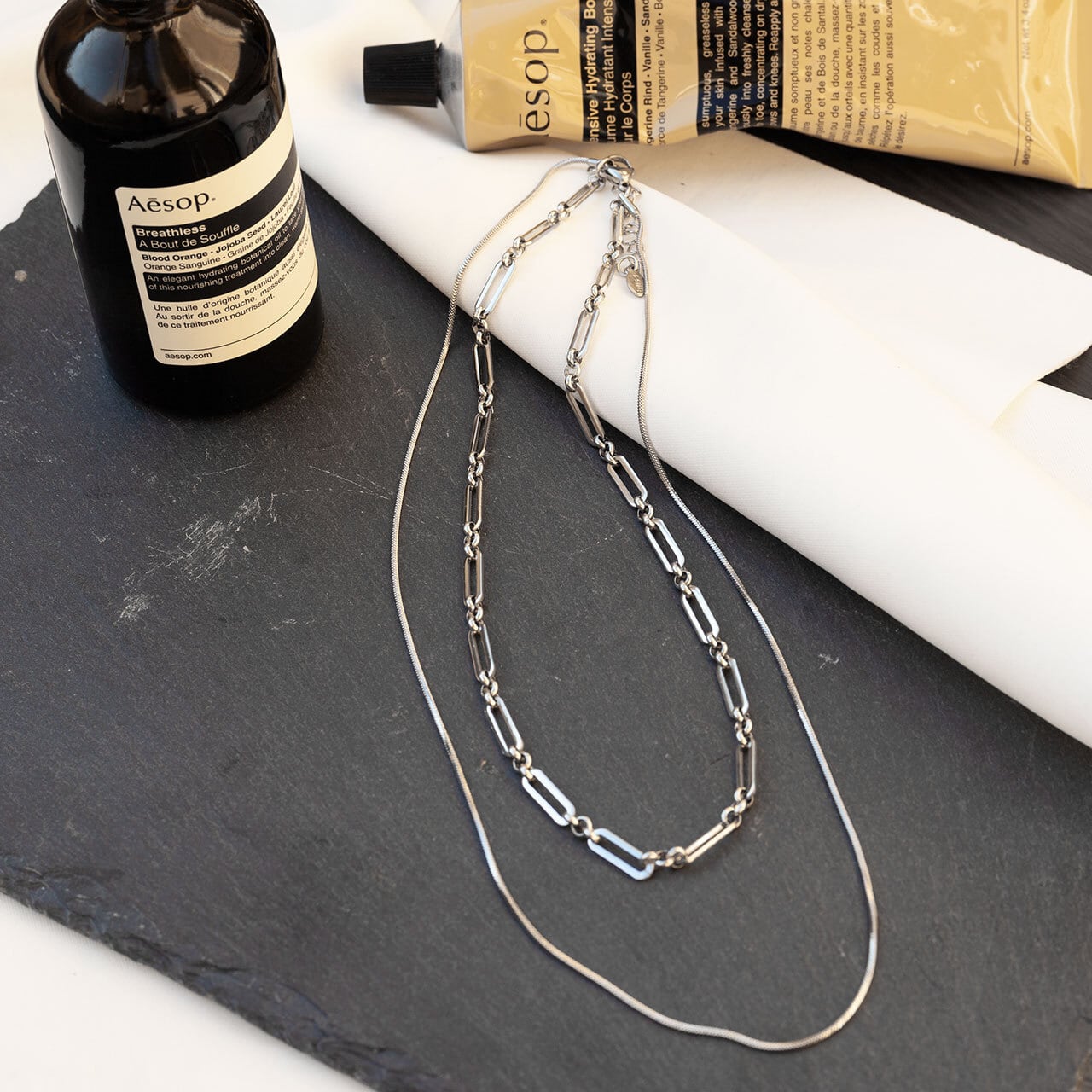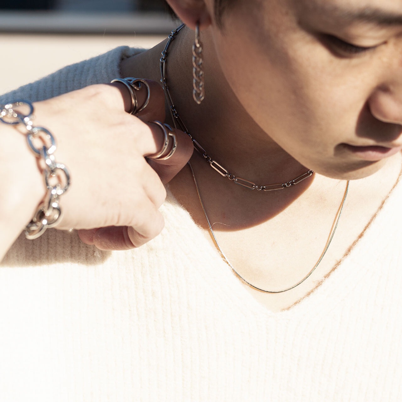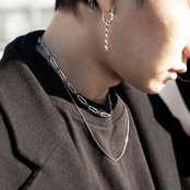 シンプルなデザインのロングネックレスと特徴的なショートネックレスがバランスが良く、